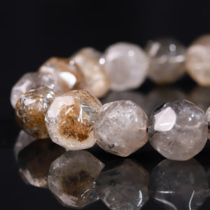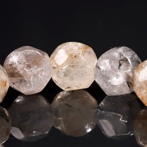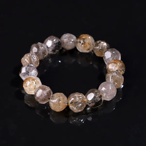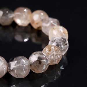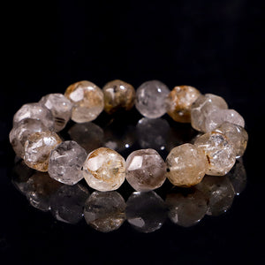 This bracelet is made from faceted Herkimer Diamond quartz, cut into multiple faces that catch and reflect light like tiny prisms.