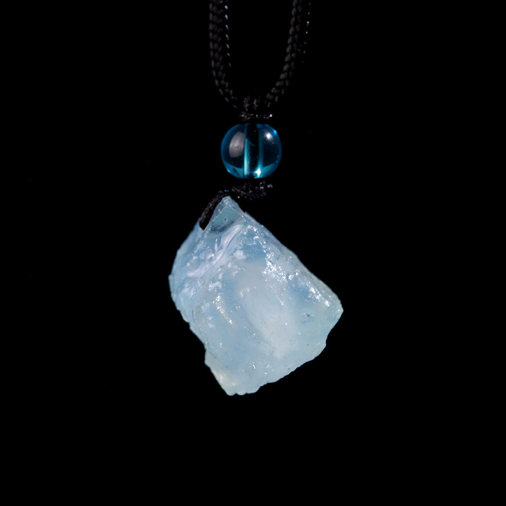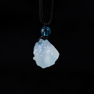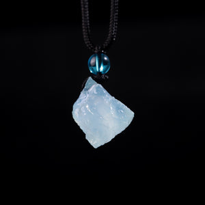 Material: Ice blue raw crystal pendant, teal round crystal bead, braided cord