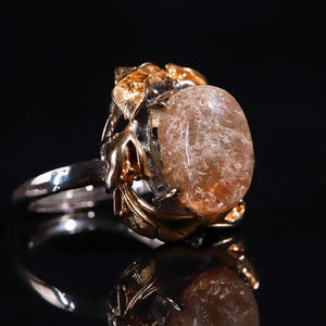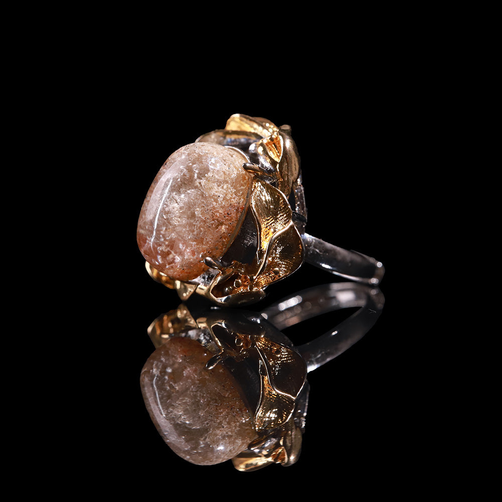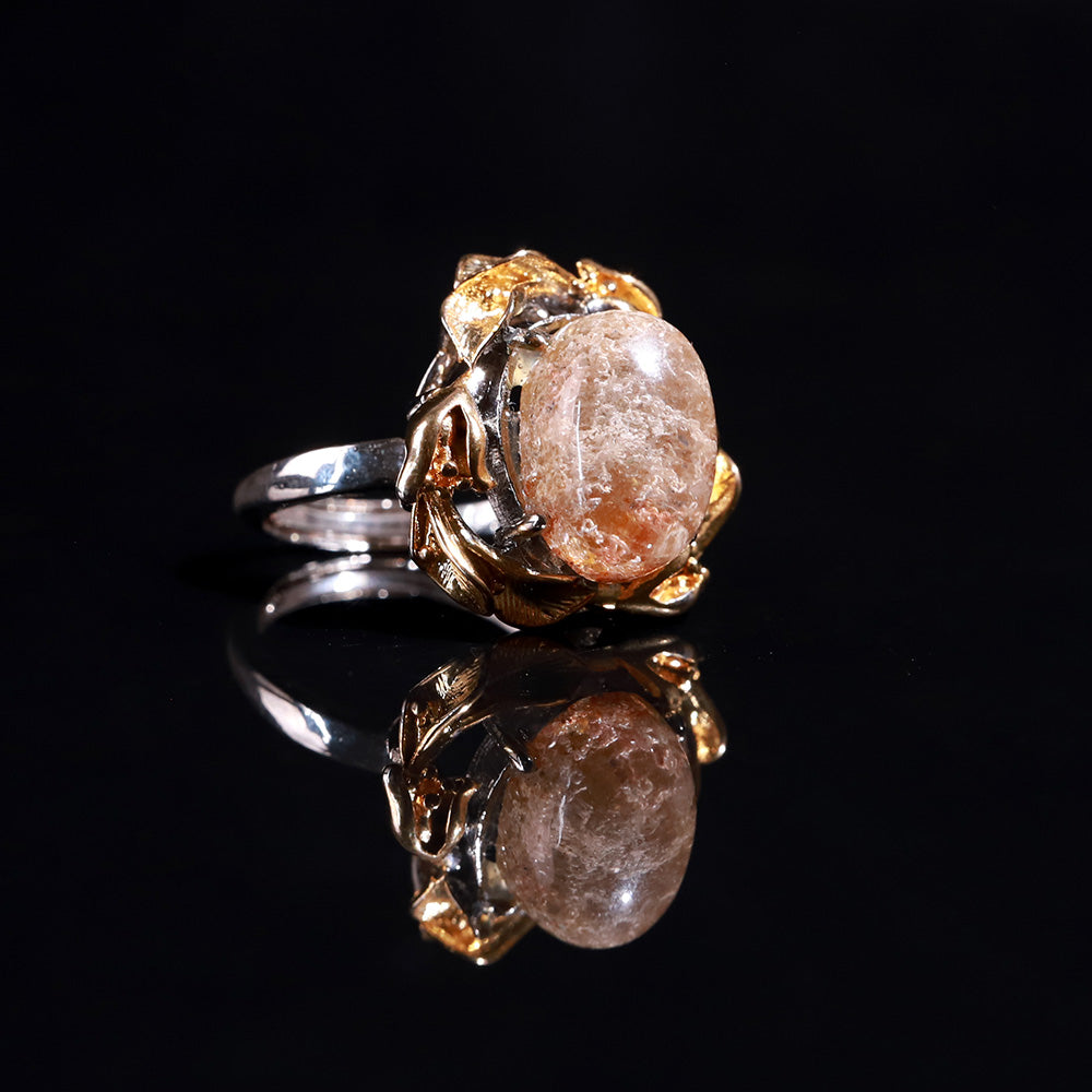 This ring features a single oval inclusion quartz crystal wrapped in an organic gold-tone crown setting — like a small flame resting on your hand.