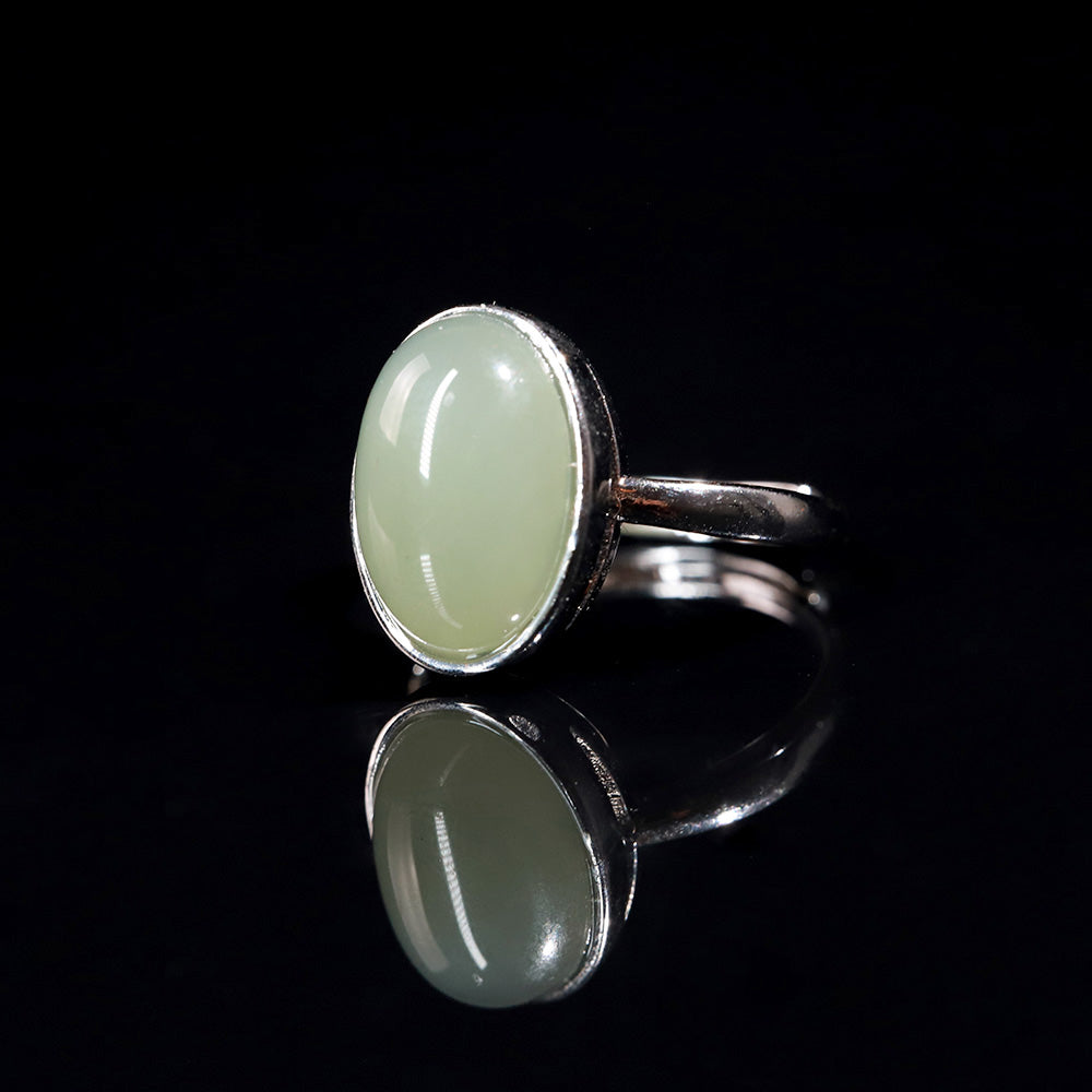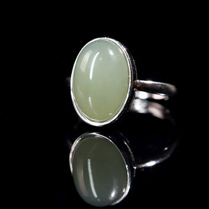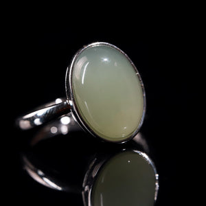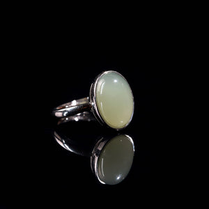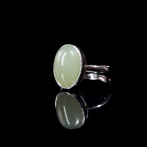 This ring features a single soft green crystal cabochon set in a simple silver-tone band, like a drop of morning mist resting on your hand.