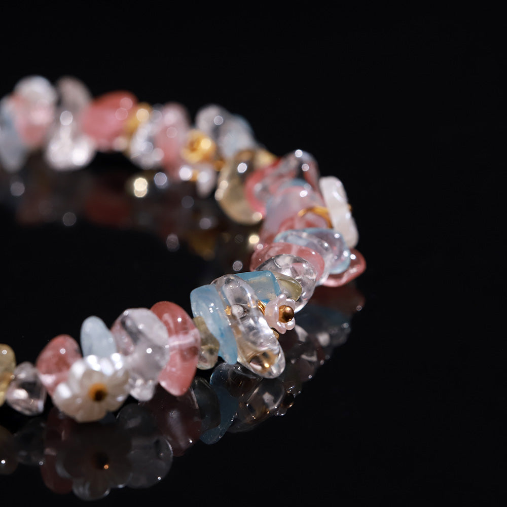 This bracelet is made from a mix of pastel-toned crystal chips in soft pink, sky blue, clear and light golden hues — like a handful of tiny candy-colored stones.